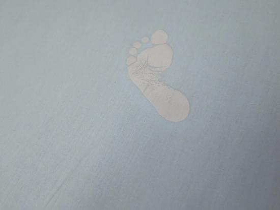 Baumwolldruck, ca. 140cm breit, mit großzügig verteilten Babyfußabdrücken, ab und an auch eine Hand.